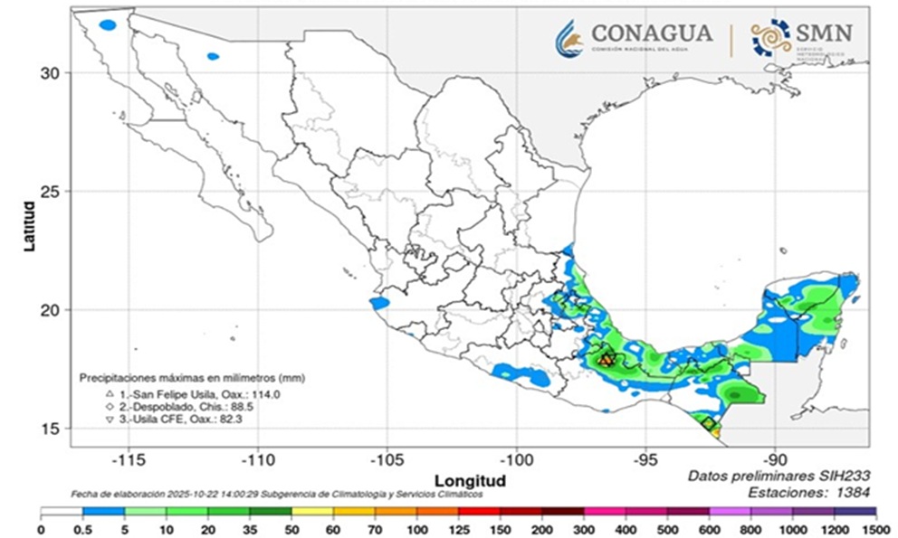 El Servicio Meteorológico Nacional (SMN) informó que este jueves 23 de octubre de 2025, la onda tropical número 39, que se desplazará sobre el oriente y sureste del país, ocasionará chubascos y lluvias fuertes en la región, así como en la Península de Yucatán, mientras que el flujo de la corriente en chorro subtropical y una vaguada recorrerán el noroeste y norte del país con fuertes rachas de viento, lluvias y chubascos en esas regiones.