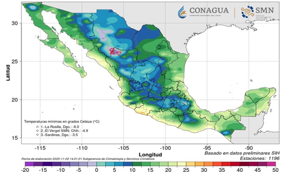 Mientras que las temperaturas mínimas de 0 a 5 grados se registrarán en las zonas serranas de estos estados el jueves 6 de noviembre: