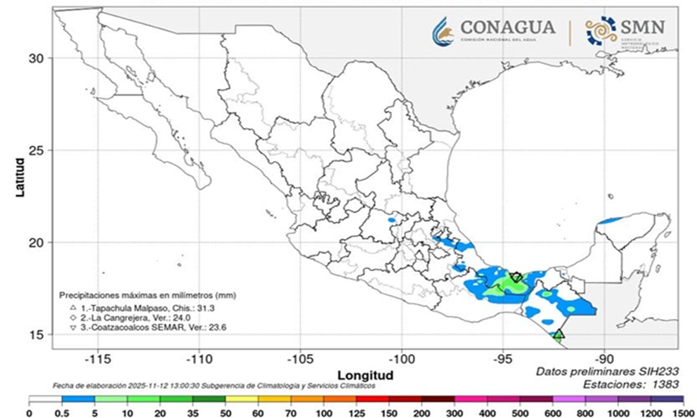 El Servicio Meteorológico Nacional (SMN) informó que este jueves 13 de noviembre, un canal de baja presión en el occidente del Mar Caribe, en interacción con divergencia y la masa de aire ártico del frente frío número 13, en proceso de modificación, originarán lluvias torrenciales, así como fuertes rachas fuertes de viento en 3 estados del país: Quintana Roo, Oaxaca y Chiapas.