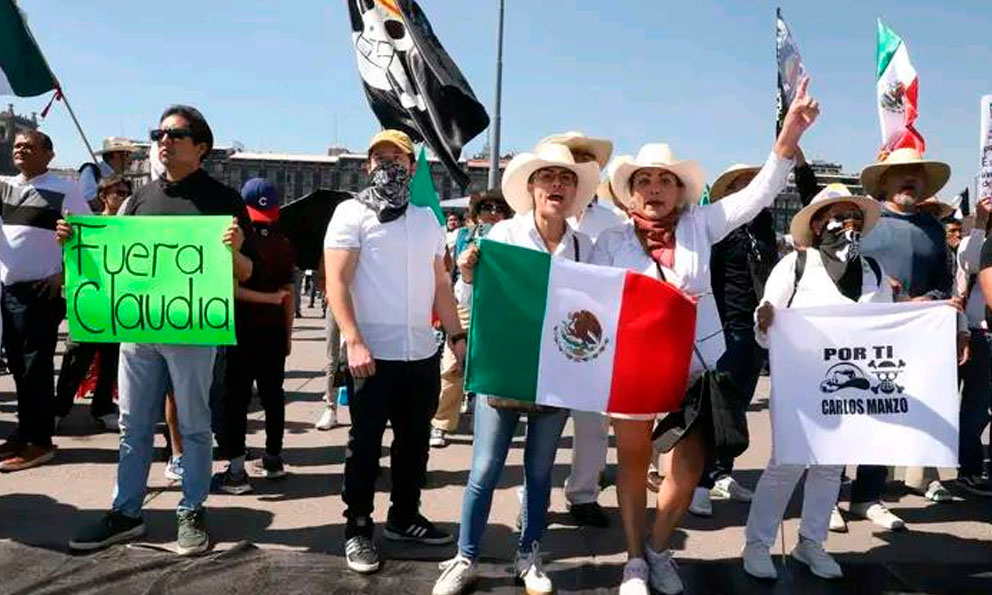 "Fuera Claudia", "fuera Morena", "fuera narco estado", "Va a caer, la 4T se va a caer", son otras consignas de enojo que corean los inconformes.