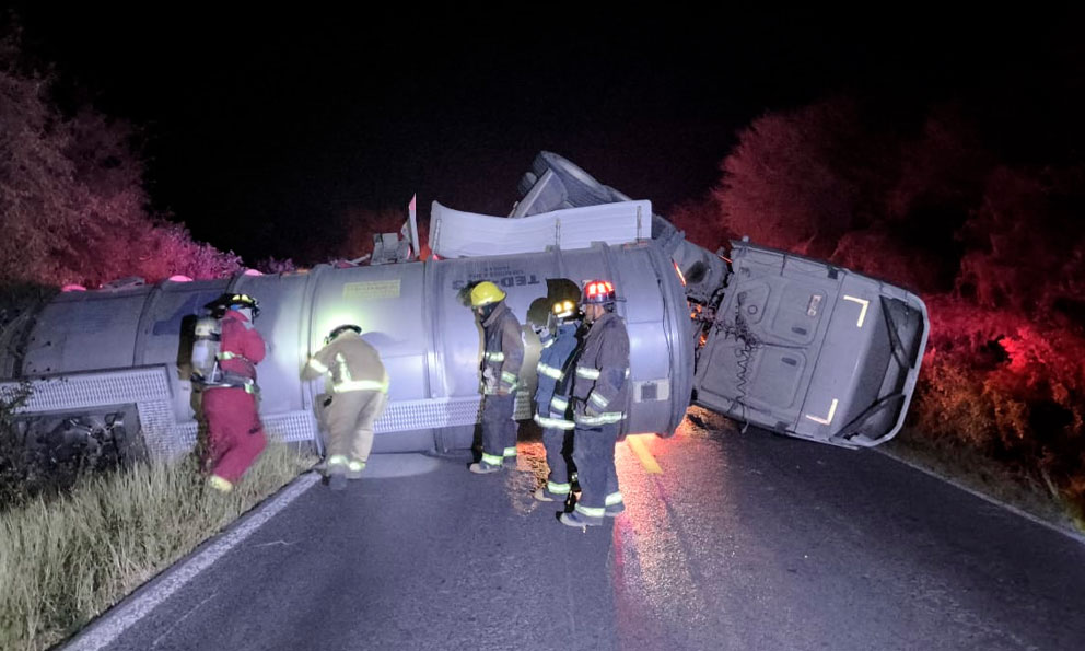 Rioverde, SLP.- Una pipa de grandes dimensiones cargada con acetona volcó la noche de ayer mientras transitaba sobre la Carretera Federal 70 en el tramo San Luis Potosí – Rioverde, a la altura de la localidad de Tecomates.