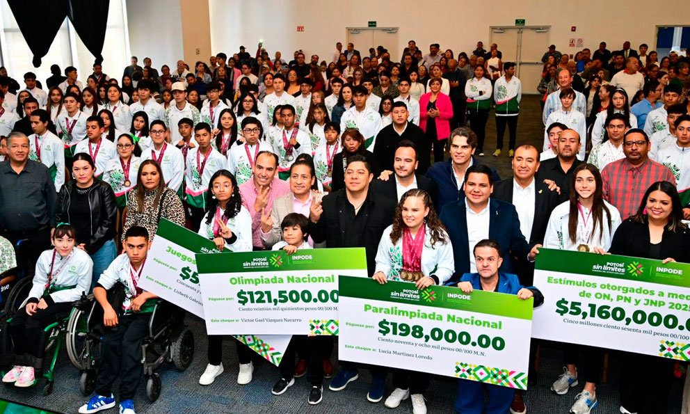 San Luis Potosí, SLP.- El gobernador de San Luis Potosí Ricardo Gallardo Cardona, entregó estímulos económicos por 5 millones 160 mil pesos a 136 deportistas que obtuvieron medallas en los Nacionales y Paranacionales Conade 2025, así como en los Juegos Nacionales Populares, donde destacó que el deporte potosino vive su mejor etapa con el trabajo de las y los jóvenes y el apoyo de la administración.