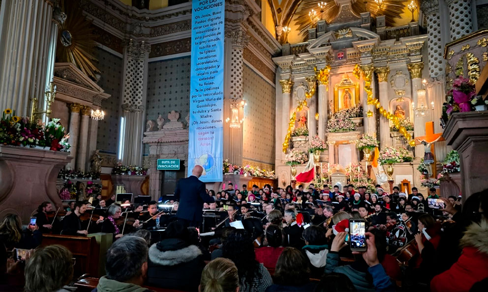 San Luis Potosí, SLP.- Con éxito y una destacada respuesta del público asistente, se presentó la Orquesta Sinfónica de San Luis Potosí en el Santuario de la Basílica de Guadalupe, como parte de la serie de conciertos que la Secretaría de Cultura del Gobierno del Estado promueve durante la temporada decembrina en distintos templos de la ciudad.