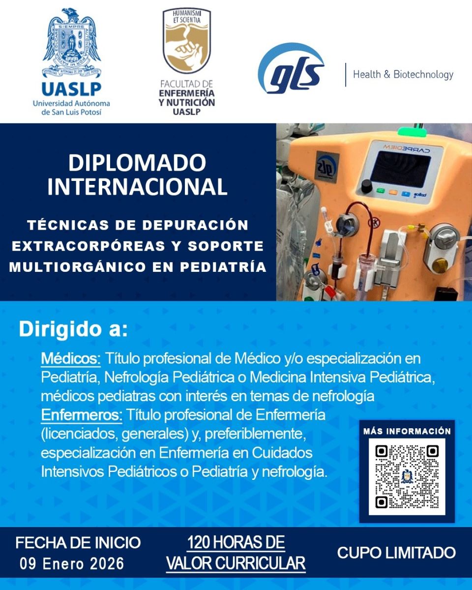 San Luis Potosí, SLP.- La Facultad de Enfermería y Nutrición (FEN) de la Universidad Autónoma de San Luis Potosí llevará a cabo el Primer Diplomado Internacional en “Técnicas de depuración extracorpóreas y soporte multiorgánico en pediatría”, dirigido a médicas y médicos, así como a enfermeras y enfermeros especializados en pediatría, nefrología pediátrica, medicina intensiva pediátrica, pediatras con interés en temas de nefrología y personal de enfermería en cuidados intensivos.