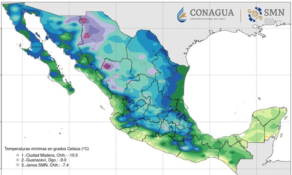 • -5 a 0 °C en sierras de Baja California, Sonora, Coahuila, Nuevo León, San Luis Potosí, Zacatecas, Aguascalientes, Jalisco, Michoacán, Guanajuato, Querétaro, Hidalgo, Estado de México, Tlaxcala, Puebla, Veracruz y Oaxaca.