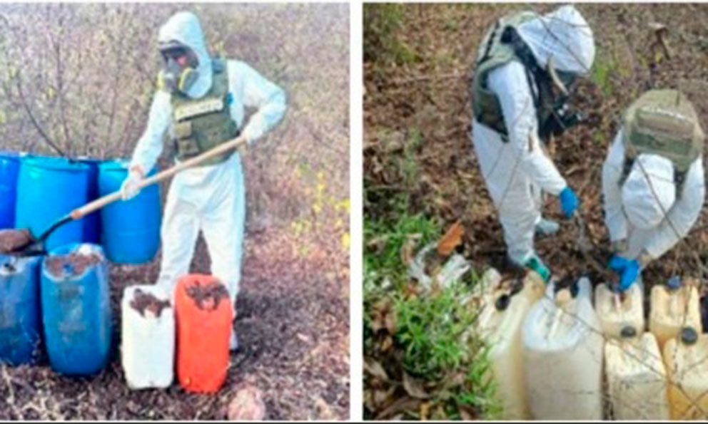 Así como 300 litros de benceno, 100 litros de metanol, 40 litros de cloro, 5,100 litros de precursor químico desconocido, 112 bidones, 1 cubeta, 55 tambos, 2 garrafas, 8 contenedores y 2 mangueras.