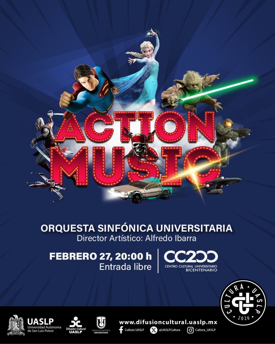 San Luis Potosí, SLP.- La música de grandes producciones cinematográficas resonará con el concierto “Action Music”, a cargo de la Orquesta Sinfónica Universitaria de la Universidad Autónoma de San Luis Potosí (UASLP), como parte de su Temporada 2026. La cita es el viernes 27 de febrero a las 20:00 horas, con entrada libre para todo el público.