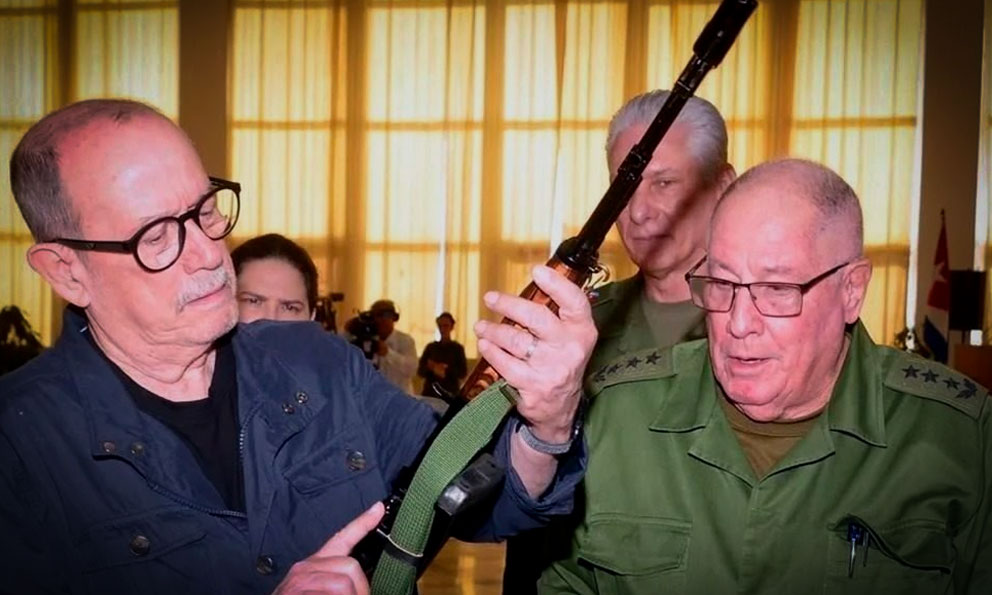 El cantautor cubano Silvio Rodríguez recibió un fusil de combate de parte del Presidente Miguel Díaz-Canel y el Ministerio de las Fuerzas Armadas Revolucionarias.
