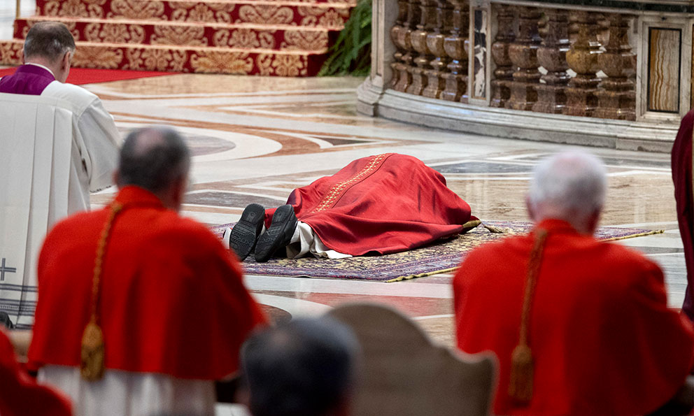 El pontífice, vestido con los paramentos rojos símbolo del martirio, empezó la ceremonia tumbado completamente sobre una alfombra ante el Altar de la Confesión, que marca el lugar exacto en el que, según la tradición, fue sepultado el apóstol Pedro.