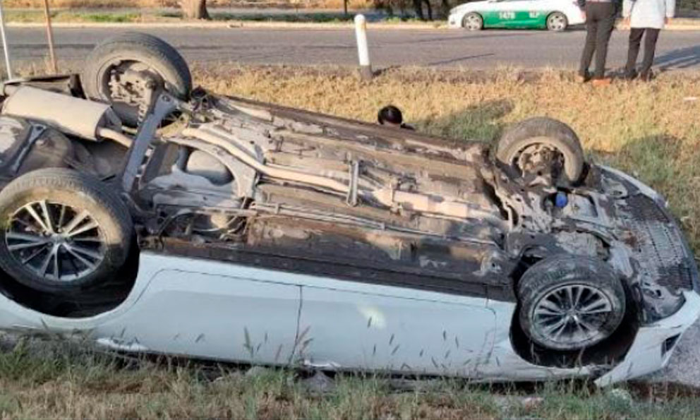 San Luis Potosí, SLP.- Un automóvil Toyota de color blanco se salió del camino y terminó volcado sobre la carretera federal 57, a la altura del kilómetro 193, cerca del edificio de la Guardia Nacional. El incidente dejó únicamente daños materiales.