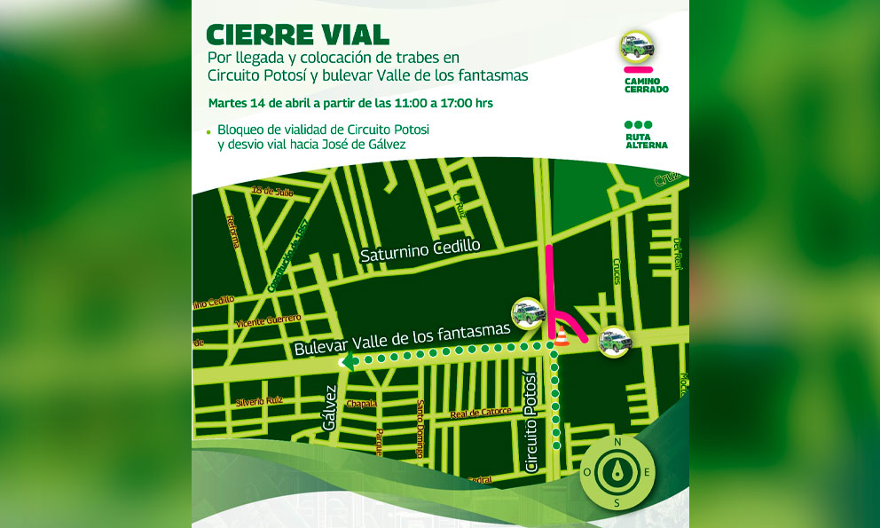 El segundo  cierre será en Circuito Potosí Oriente con dirección a Bulevar Valle de los Fantasmas, donde el tráfico será desviado hacia la calle Saturnino Cedillo para incorporarse a José de Gálvez. Los cierres serán este martes 14 de abril de 09:00 a 17:00 horas en la primera suspensión mencionada y de 11:00 a 17:00 horas en las dos restantes.