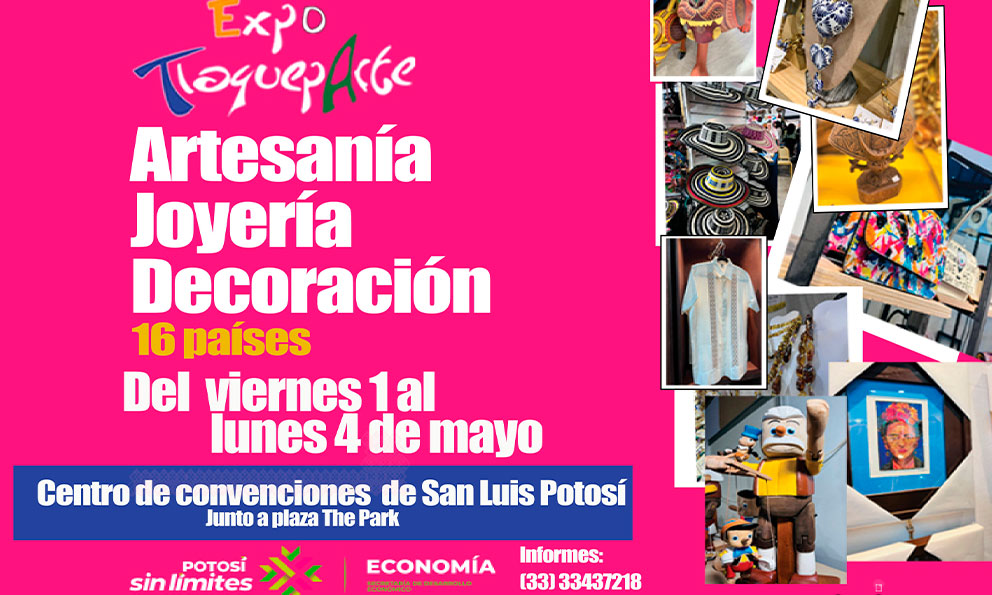 Llega a San Luis Potosí Expo TlaquepArte, la exposición internacional de “Artesanía, Joyería y Decoración” más importante de México con más de 17 países invitados y 25 estados de la República Mexicana a precios de fabricante. Nos vemos en el Centro de Convenciones ubicado a un costado de Plaza The Park del viernes 1 al lunes 4 de mayo… ENTRADA GRATUITA… Informes: (33)33437218