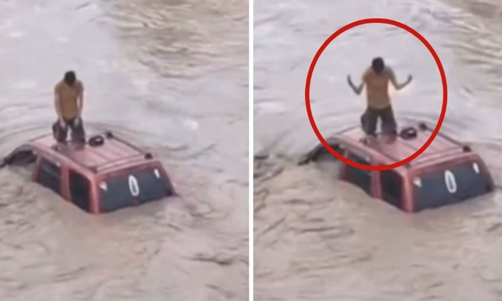 Captan a hombre atrapado sobre su camioneta tras las lluvias en Veracruz