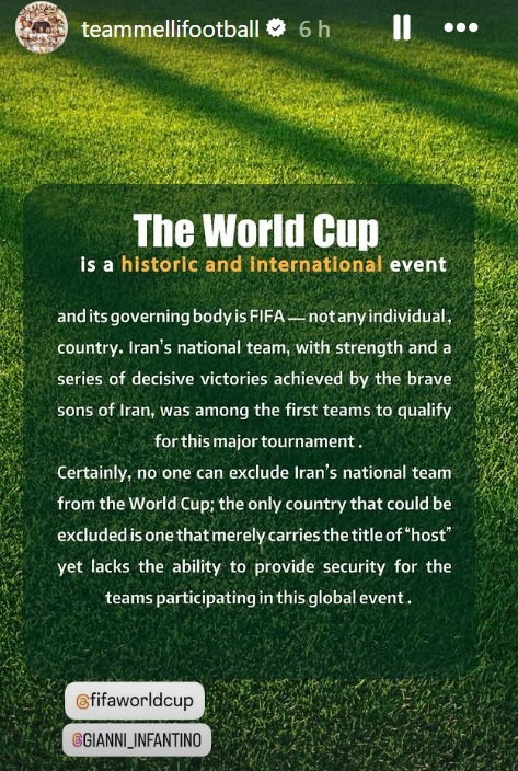 Irán obtuvo su boleto al Mundial en la cancha durante las eliminatorias, pero las condiciones políticas han complicado su presencia en el certamen organizado por la FIFA. Incluso, el presidente de Estados Unidos, Donald Trump, afirmó que no considera apropiada la participación del equipo iraní, lo que avivó la polémica.