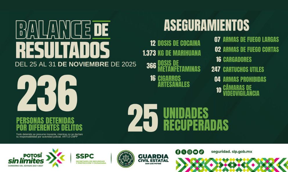 Concluye semana con 236 detenciones